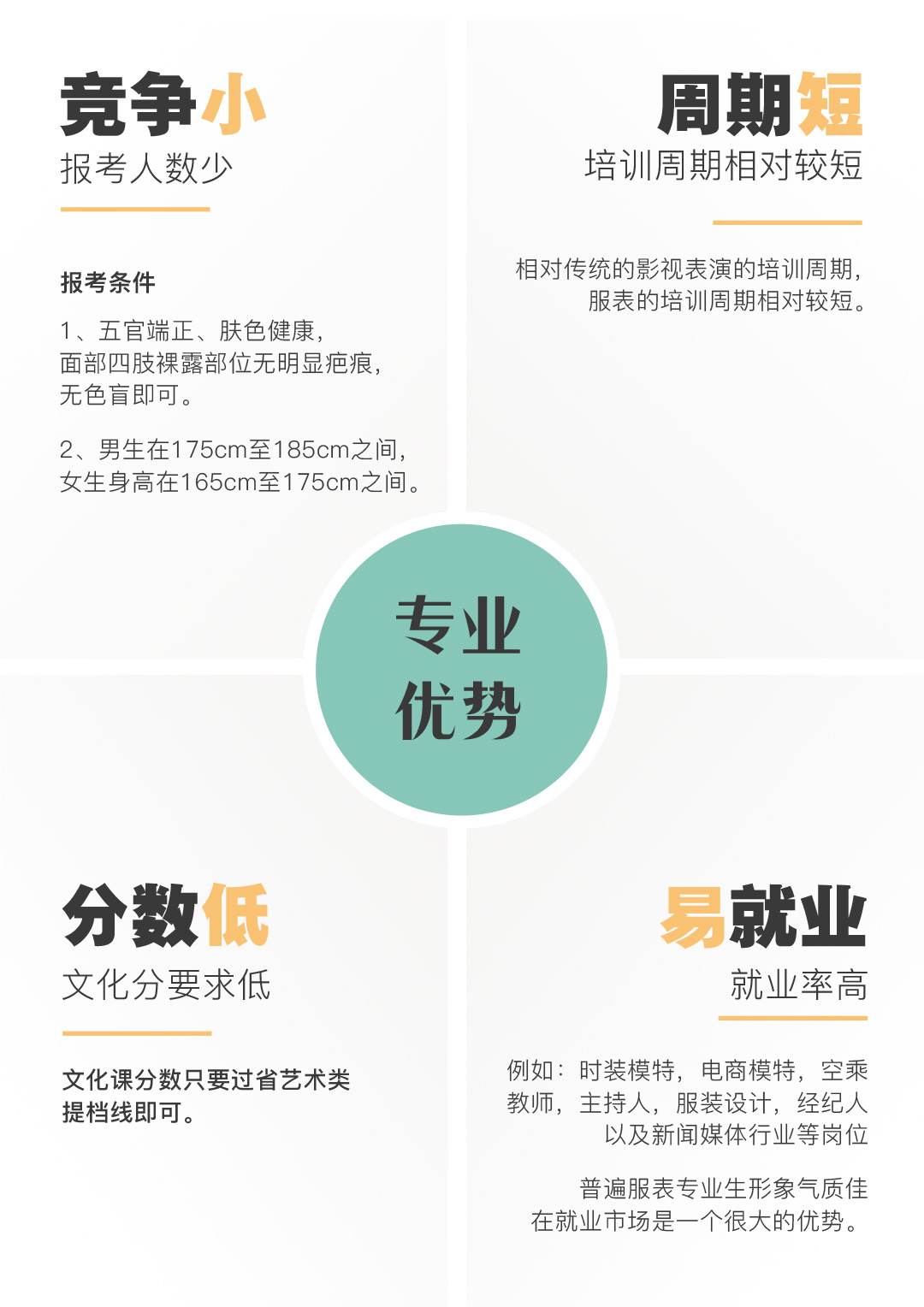 時裝表演(服裝表演)專業屬于新興的高校學科,作為浙江省八大藝術專業類別之一,同其他藝術類專業一樣需要統一參加專業考試和高考文化課考試。隨著服裝行業的迅速發展,服裝的展示環節中對文化內涵的不斷提高,模特行業也被賦予了新的評判標準?!澳L亍痹僖膊荒苤皇钦故痉b的“道具”,而應該是有學歷、有文化、有修養的一批專業技能型人才。